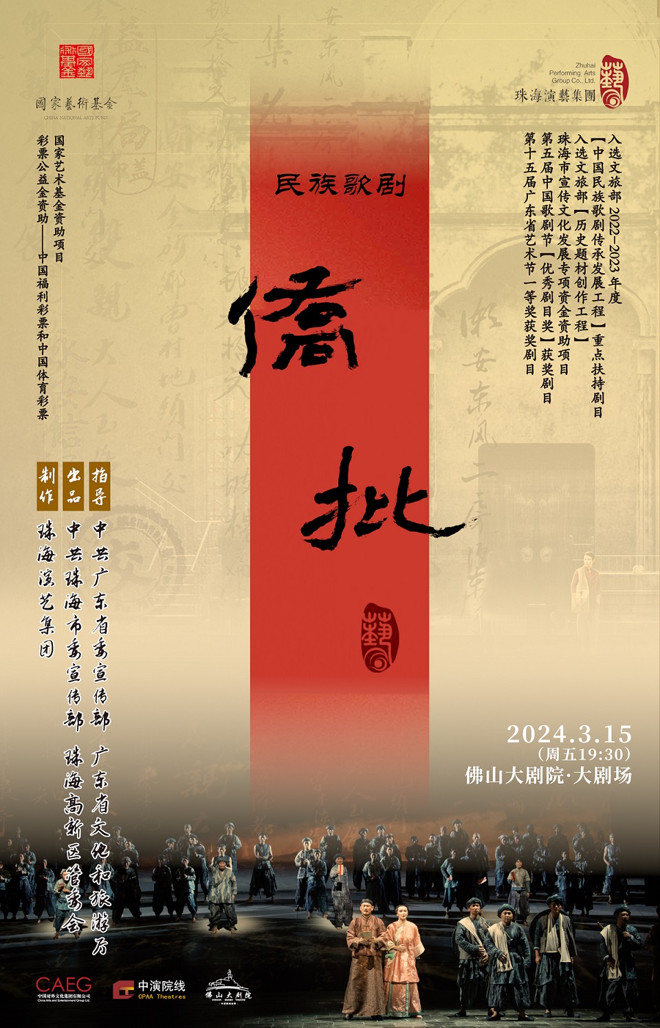 《侨批》是由珠海演艺集团制作、珠海歌舞团演出的大型民族歌剧。该剧历时两年创排,以珠海唐家湾历史文化为背景,讲述海外华侨讲信誉、守承诺的艰难创业史与浓厚的家国情怀故事。