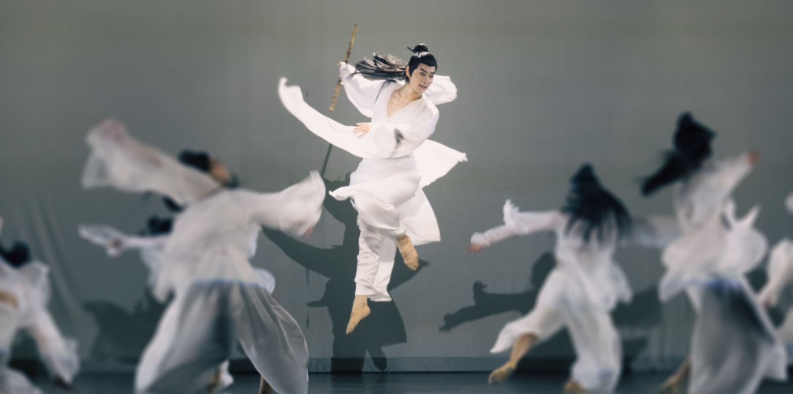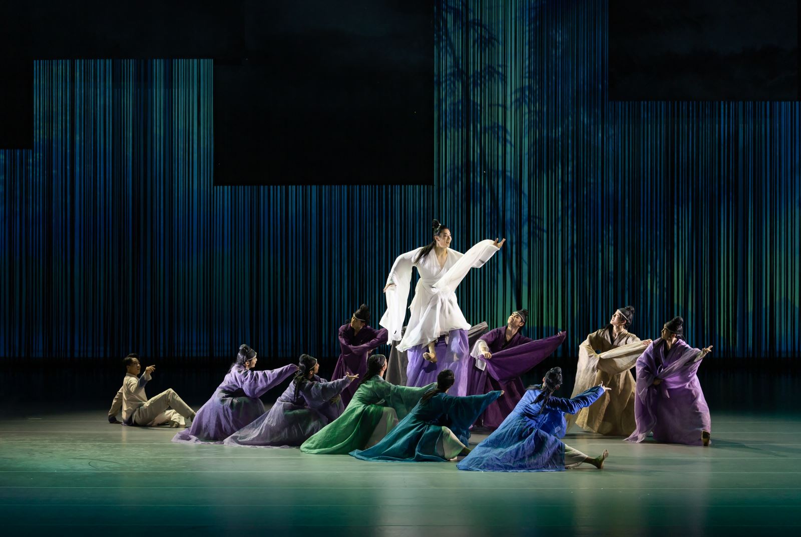 以舞为媒介,在《兰亭集序》跨越千余年的传奇命运中找寻古今世人的情感共鸣;以舞为载体,发现书法的艺术魅力、文化底蕴与精神内涵;以舞为窗口,看到书法这一最具代表性的中国传统文化符号之一的“创造性转化、创新性发展”,情随墨流,舞随情动。以唯美、浪漫为基调,运用科技创新的舞美手段创造时空交融的舞台新空间,为观众打造一场极富江南山水之美的视觉盛宴。在表演形式与舞蹈语汇上,通过刚柔并济、飘逸潇洒的男子群像,尽展《兰亭集序》中的审美理想和意趣,勾画不滞于物、特立独行的魏晋之风。