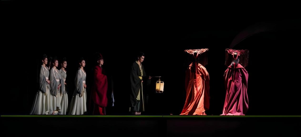 The entire stage is filled with a paper-cut sculpture-like texture, complemented by the art of negative lighting, blending the real and the illusory. Chief Director Wang Tao Rui has created two layers of illusion for the audience: one is Xi Shi's fantasy about love, the other is the illusory, decadent facade of luxury created by Gou Jian for the State of Wu as part of his plan to restore Yue.