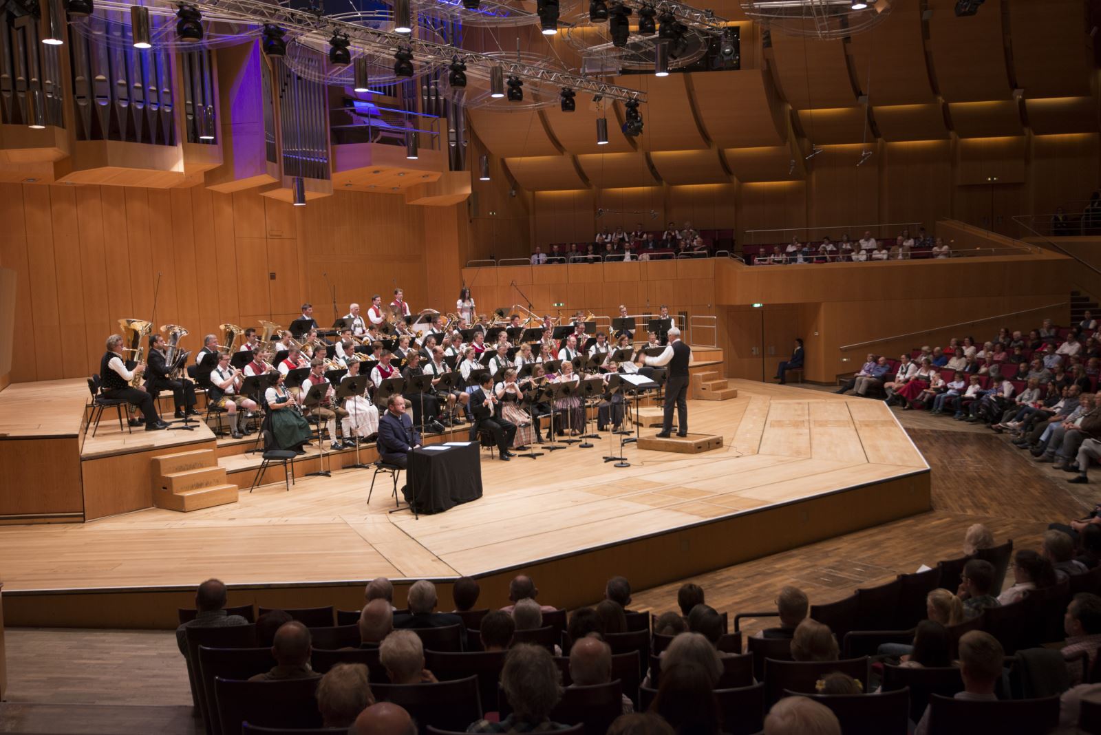乐团也在录音出版领域深耕多年。其专辑《Bayerische Blasmusik: Meisterwerke für Sinfonisches Blasorchester》收录多首改编经典,已被德国音乐学院管乐系纳入教学参考音源;《Wind Echoes: Contemporary Symphonic Works from Bavaria》专辑收录多位德国当代作曲家的委约之作,并由Genuin Classics出版,获得《Fono Forum》杂志四星推荐;《Symphonic Strauss》系列则完整收录《蝙蝠》序曲、《蓝色多瑙河》、《皇帝圆舞曲》等多首经典圆舞曲,为理解德奥传统管乐风格提供了权威范本。此外,乐团还与维尔茨堡音乐学院、慕尼黑音乐与戏剧学院等高等学府合作录制多张示范性教学录音,用于德国联邦级管乐比赛、考试与教材出版。